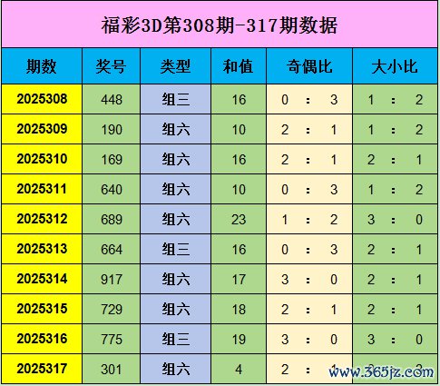 福彩3D上期开出奖号为301,奖号为组六情景,和值为4,奇偶比为2 : 1,大小比为0 : 3。