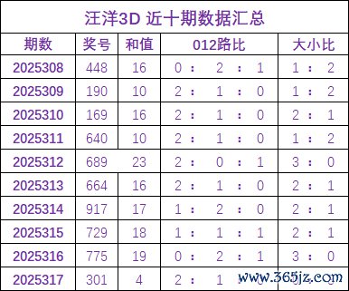 开奖总结:福彩3D开奖号为301,和值为4,其中奖号012路比为2:1:0,大小比0:3。